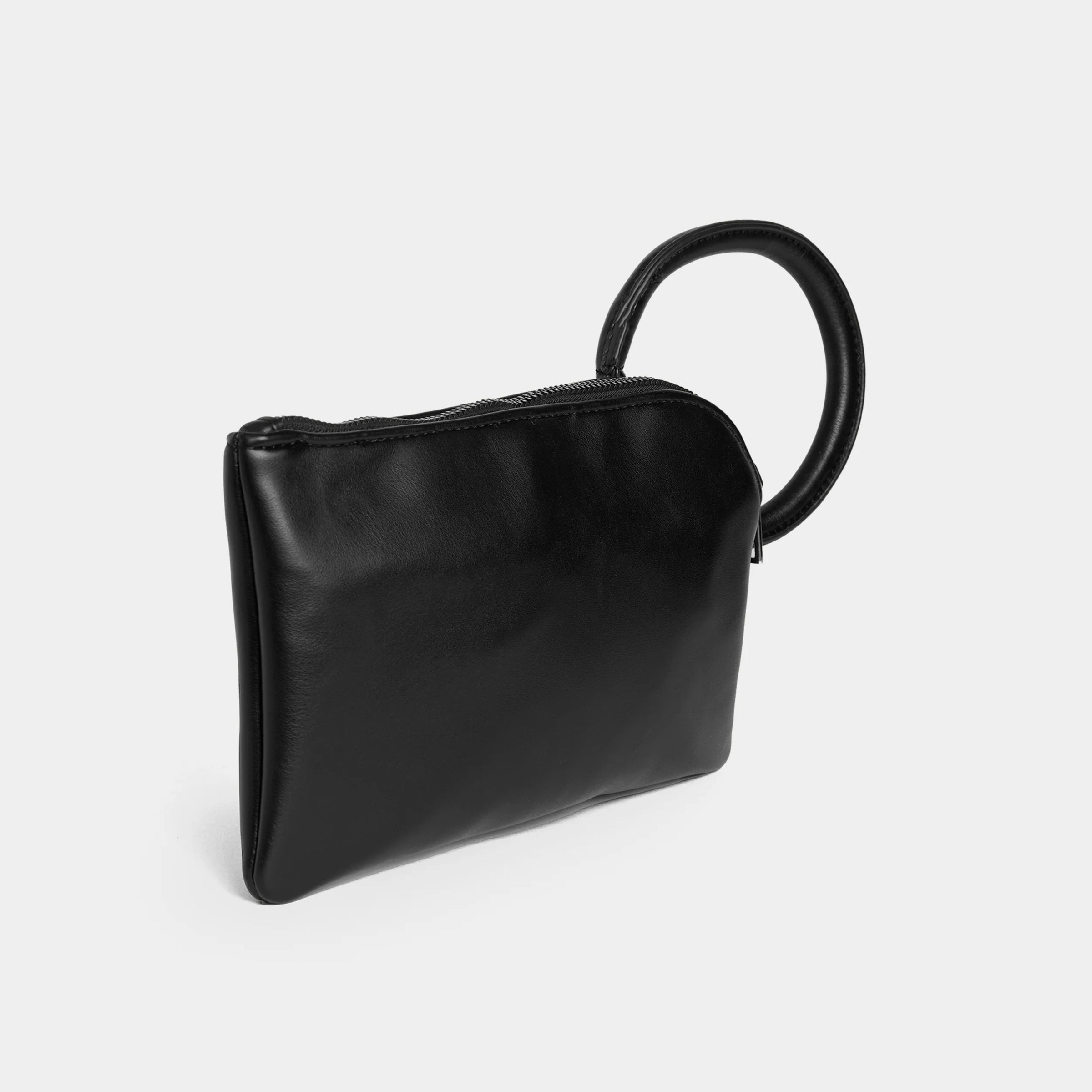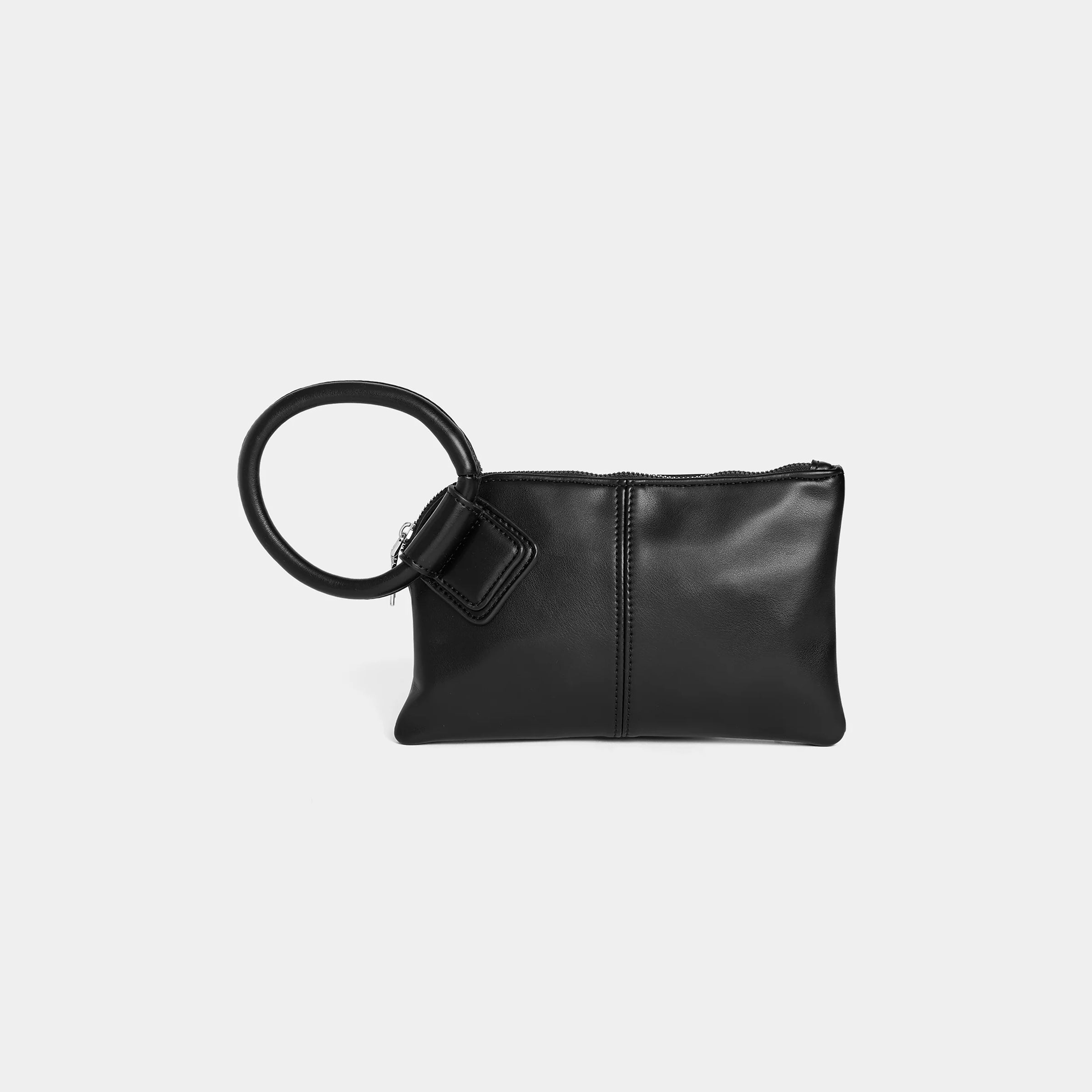 This compact bag features a built-in bangle to carry with ease, zipper reveals printed lining and built-in card slots. Metal hardware.