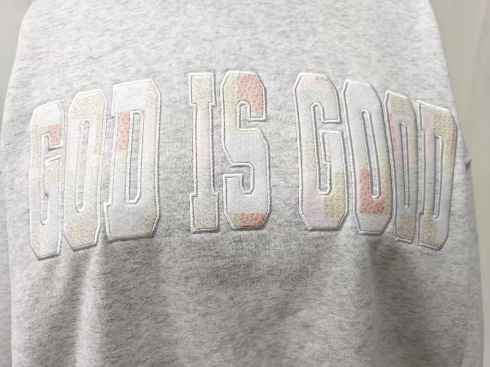 Sunkissed Coconut God Is Good Quilted Pastel Embroidered Pearl Grey Sweatshirt