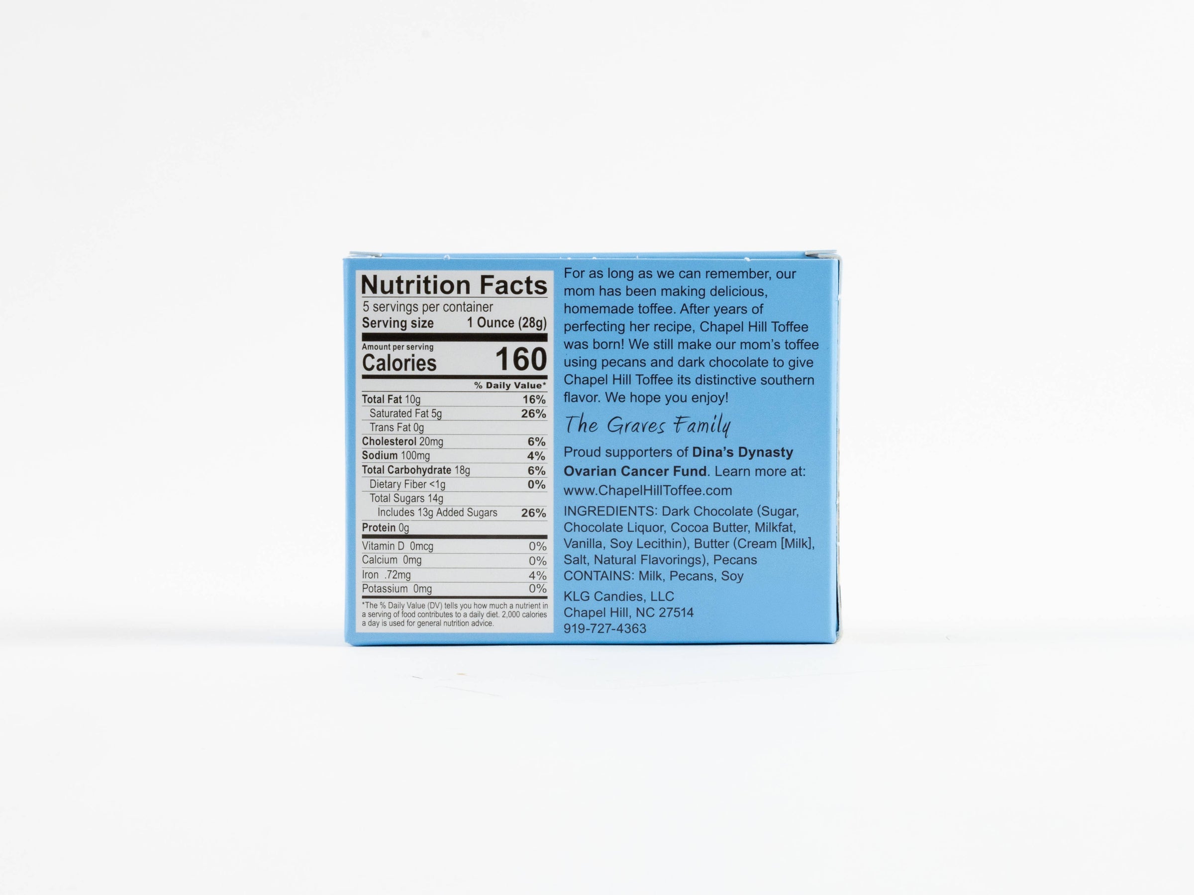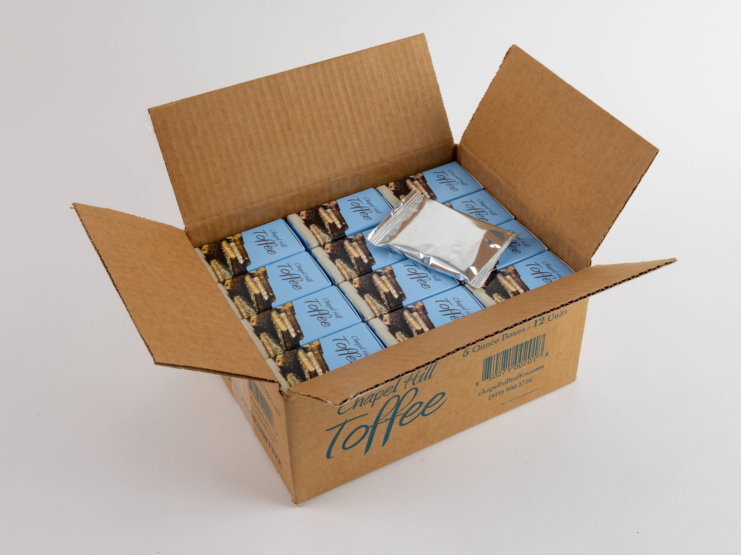 One 5-ounce box of handcrafted, gourmet Chapel Hill Toffee. Made with the finest ingredients for a taste experience that is both nostalgic and indulgent.