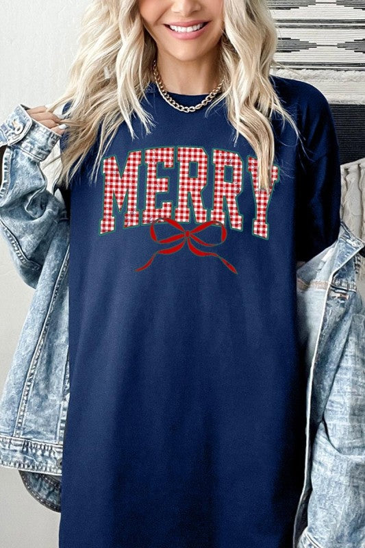 Plaid Merry Christmas Bow Navy Tee